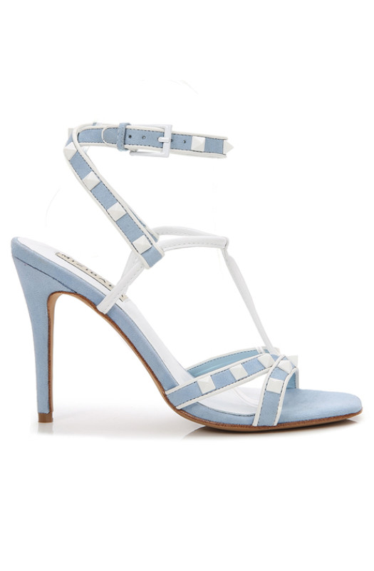LIGHT BLUE STRAPPY WHITE RIVETS 100MM HEEL DRESS SANDALS